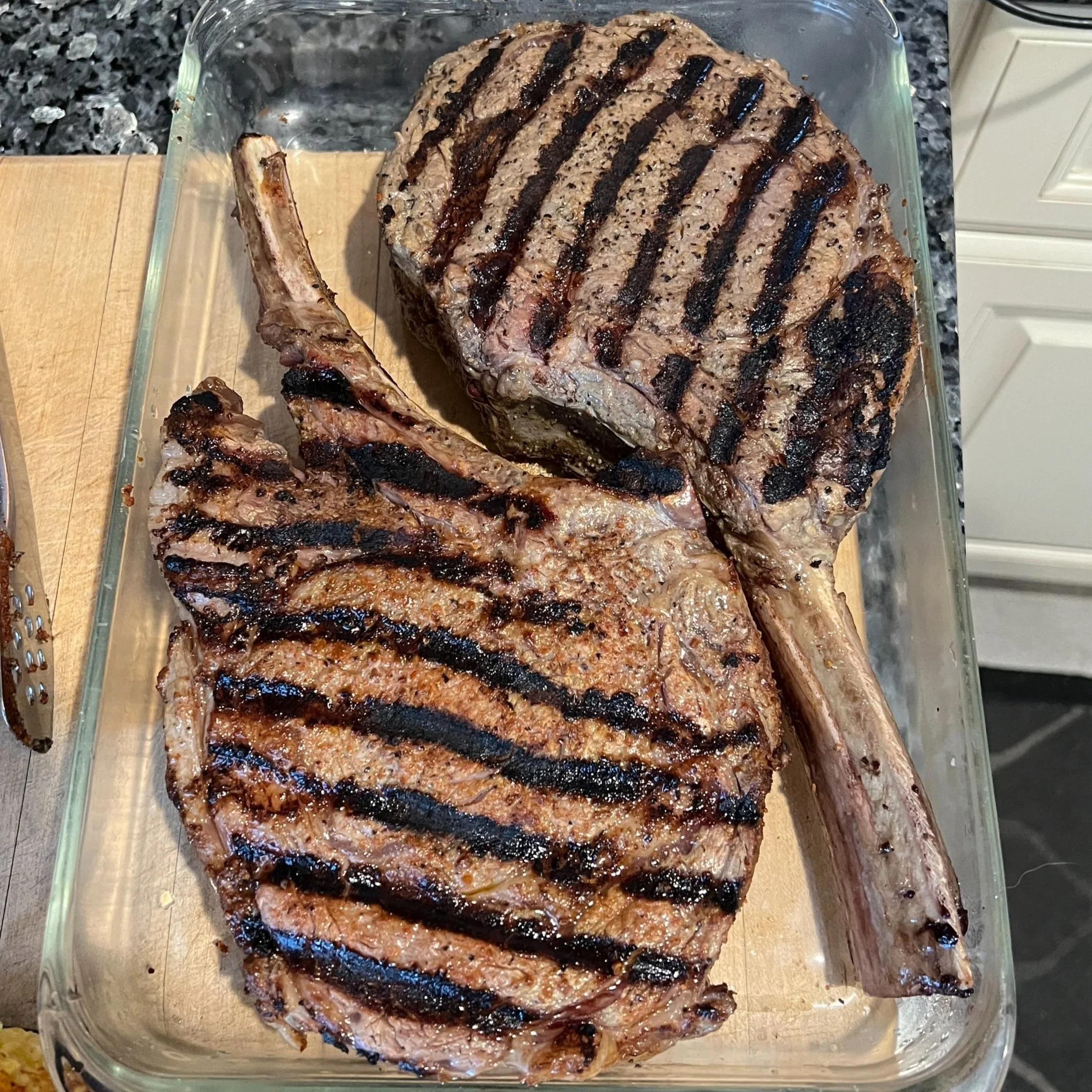 Tomahawk steaks- cooked medium rare, one seasoned with smokey butcher’s salt and the other seasoned with pepper and spicy mojo seasoning (see below for how to cook).