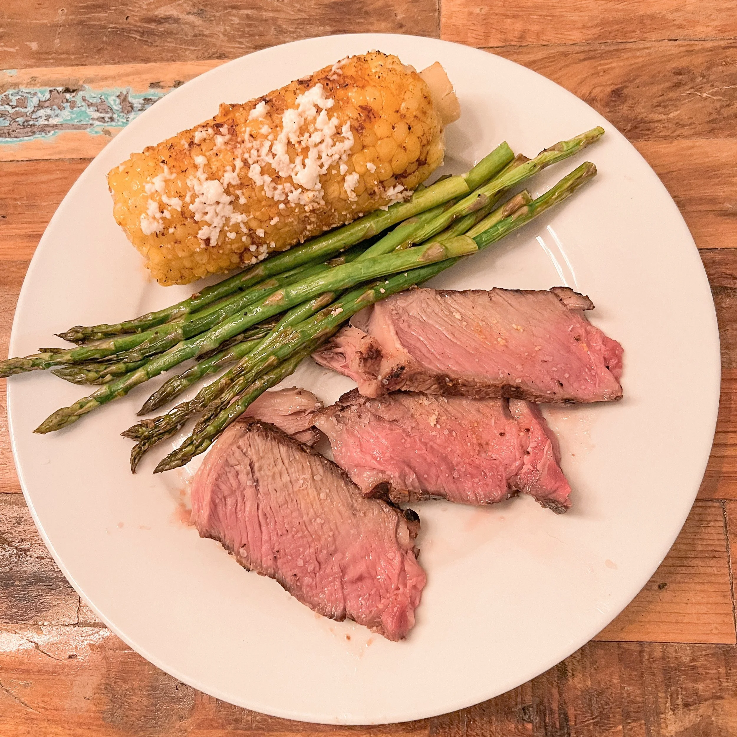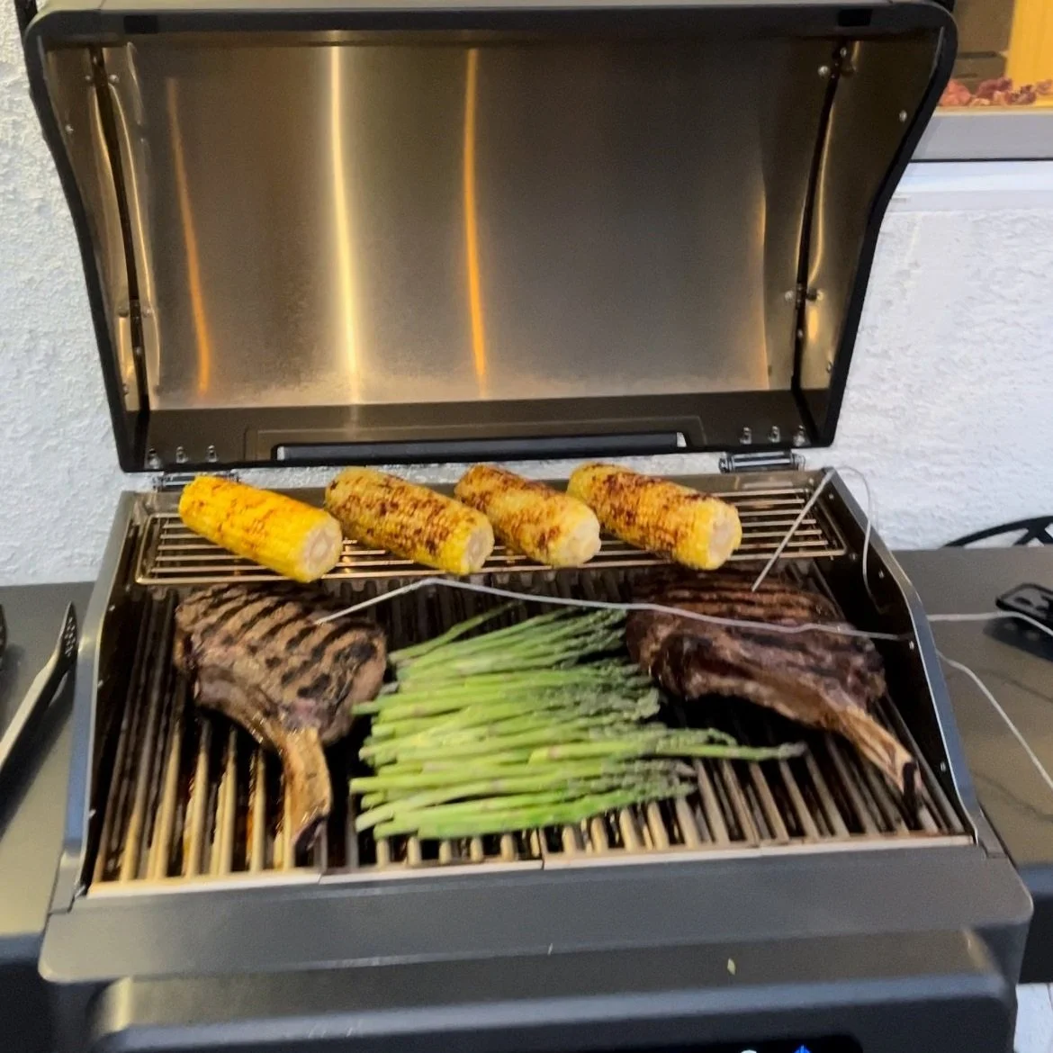 The steaks were first seared for 3-4 minutes on each side (due to thickness) at 700 degrees. Then the grill was cooled down to 300 degrees to finish them off to a medium rare. We used the integrated temperature probe and the app to monitor the cooking process. Once done, we took them off the grill and let them rest for ten minutes while the corn and asparagus were finishing. They were cooked perfectly and were delicious.